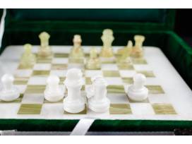 Chess set made of banded Onyx, in a plush, dark green case.