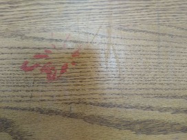1Previously owned oak table with 2 drawers; approx 28"H x 41 1/2"L; does have a small red stain on the top.