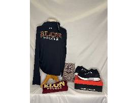 The package includes a pair of UA womens 9.5 shoes, an Elon Soccer scarf, a UA dri-fit women's L t-shirt, and a UA dri-fit women's L long sleeve with hood.