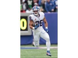This is a Riddell Speed New York Giants mini-helmet. It features Saquon Barkley's signature right on the crown, perfect for display.