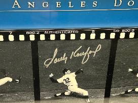 This is a signed reel of Sandy Koufax hurling a pitch from the mound. Framed measuring 27"x16".