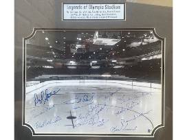 1Here is a display featuring Olympia Stadium home of the Detroit Red Wings. It has been signed by 11 Detroit Red Wings, Hall of Famer, who played their career there. It has been signed by legendary Hall of Famer, Gordie, Howe, and the rest of the production line Sid Abel and Ted Lindsay. it is also been signed by Alex Delvecchio , Norm Ullman, Bill Gadsby, Marcel Dionne,Frank Mahovlich, Marcel Pronovost, Daryl Sittler and Mickey Redmond.