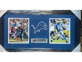 This display features two 8 x 10 photographs of Johnson one of which has been autographed. It was signed in blue sharpie. It comes with the letter of authenticity. this display features a lions logo and informational plaque on Johnson's career statistics. This display measures 18 x 33.