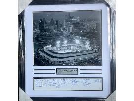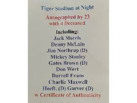 Here is a display of historic tiger stadium of the Detroit Tigers 1912-99. This display features a photograph which measures 16 x 20" of tiger Stadium taken at night. Beneath this photograph is a historical plaque of Tiger Stadium, And 23 original autographs of tiger greats who played there.