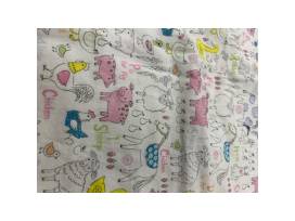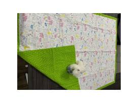 Handsewn 51" X 39" animal alphabet blanket, trimmed in green with polka dots. Back is green with white polka dots. Blanket also includes a stuffed lamb.