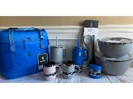 This wonderful Hydro Flask Bundle contains an assortment of Hydro Flask items including: a 20L soft cooler, 2 - 32oz Travel Tumblers, 2 - 12oz Coffee Mugs, a 5 qt Bowl with Lid, a 3 qt Bowl with Lid, Serving Spoons, and an 8oz Food Jar.
