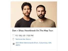 Two (2) tickets to the Dan + Shay Concert on Friday, March 15th, 2024 @7:00 PM - Nationwide Arena, Columbus, OH; Section 210, Row M, Seat 5 and Section 210, Row M, Seat 6