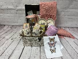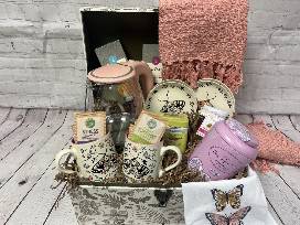 Pink Electric Glass Kettle, (2) Butterfly Tea Mugs, (4) Butterfly Tea Plates, Butterfly Tea Towel, Organic Passionfruit Tea, Honey Lemon Green Tea, Stress Balance Tea, Organia Peppermint Tea, Italian Honey, Scottish Shortbread- Sea Salt Caramel- Toasted Almond, Dusty Pink Woven Throw Blanket.