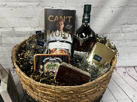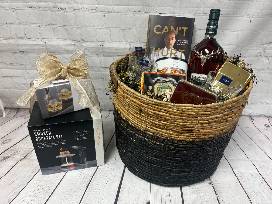 Dalmore Malt Scotch Whiskey Aged 15 Years, (4) Crystal Whisky Glasses, Alchemi Smoked Cocktail Kit, Viski 14K Gold Plated Flask, Sur la Table Skull Ice Molds, Excalibur Natural Cigars (20), Arturo Fuente Cigars (10), Sur la Table Siracha Ranch Bar Snacks, Can't Hurt Me by David Goggins Book.