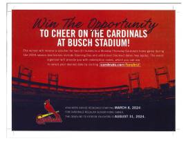 Two tickets to a St Louis Cardinals Monday-Thursday home game during the 2024 season (exclusions include Opening Day and additional blackout dates may apply).