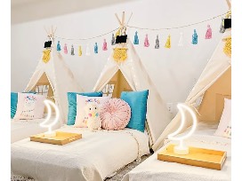 Includes: 2 teepee tents, air mattresses, electric air pump, fitted sheets, fleece blankets, themed decor, throw pillows, twinkle lights, rugs, personalized cinema lightbox, breakfast trays, and personalized nameplates.