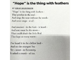 The piece Suzanne donated is titled, "Hope is the thing with Feathers." Suzanne's goal of creating this work of art was to illustrate the poem (with the same title) written by Emily Dickinson and to suggest that Hope will always be present within us all.