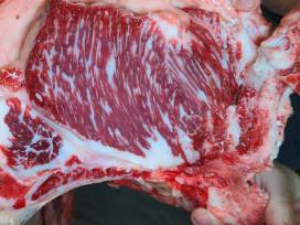 The carcass picture is from a one-half paternal brother to 51J. As you can see the marbling and quality runs deep in the MICHIFUKU line of genetics, and 51J has MICHIFUKU on both sides of the pedigree helping to account for the AA SCD Score. 51J is a very shapely bull with added muscle through his top and rear 1/3, he is deep bodied and powerfully constructed, he gives you the look of a REAL BEEF BULL!