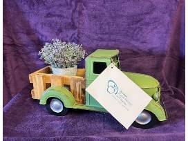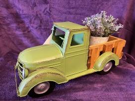 This cute little green metal truck decor measure's 18" long and 10" high. Traveling with a bed of beautiful purple spring flowers.
