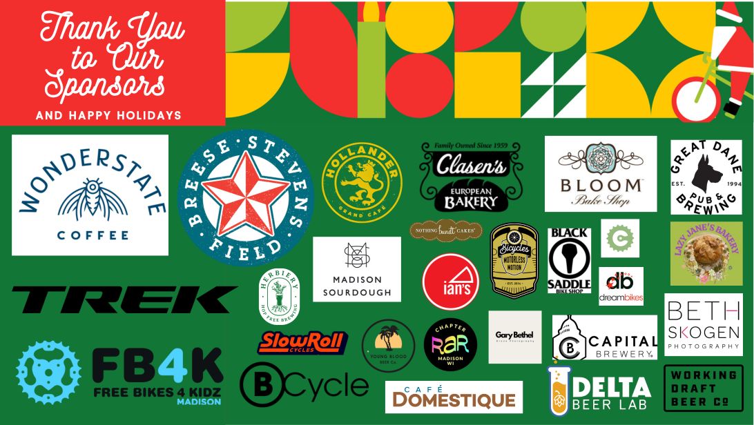 Each ride will converge at Breese Steven Field where we will depart around 11am for a 5-8 mile group ride. We will make a large loop returning to the stadium around 12:15pm (or earlier depending on weather). From there the official ride is over. You are encouraged to spread the holiday cheer at our partner locations and support local businesses by bike.