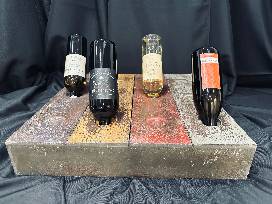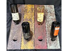 Transform your home into a charming wine haven with this rustic wine rack paired with four assorted bottles of fine wine! Crafted with care and character, the wine rack exudes rustic elegance, adding a touch of countryside charm to any space. Accompanied by a selection of four quality bottles, each offering a unique taste and story, this ensemble promises delightful evenings of indulgence and relaxation. Elevate your wine experience and bring a touch of rustic sophistication to your home! Measures approximately 22.5 x 23.5 inches.