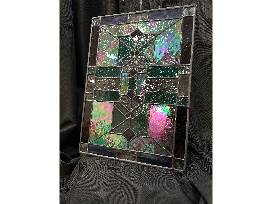 Enhance your home and immerse yourself in the beauty of craftsmanship with this meticulously crafted stained glass wall hanging. Handmade with care and precision, this piece embodies a captivating fusion of purples, blues, greens, and clear glass. Its artisanal charm shines through its unique design, adding a delightful accent to any space.