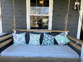 This custom porch swing can be yours and is large enough to fit the whole family! The day bed is a twin-size mattress and is the perfect addition to any front porch or back yard for those lazy summer days. The swing will be custom built to include stain of choice, mounting hardware if needed, and chain or rope to hang.