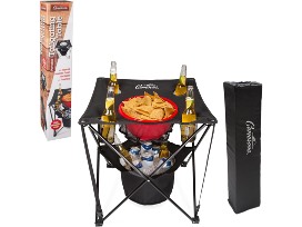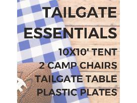 Tailgate all summer with a new 10'x10' Tent, tailgate table, two green, folding camp chairs, 125-piece white disposable plates.