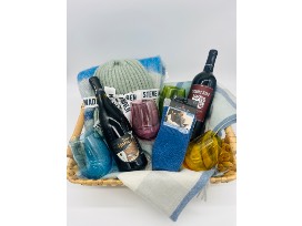 Cozy up in front of the fireplace or in the fish house for the weekend with this basket of warming goodies. Enjoy two pair of plush Cuddl Duds leg layering crew length socks, a deluxe Steve Madden cable knit hat and scarf set, and a super soft Pretty Persuasions pashmina scarf/wrap. Sip on a bottle of Dave Harvey Syrah and Gnarly Head Authentic Red wines in one of your four new stemless wine glasses. Which one is your favorite color? Bonus is the wicker basket with adorable wooden handles.
