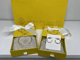 Add a touch of elegance to your wardrobe with this stunning jewelry set donated by Kendra Scott! An edgy design meets sparkly details in the Jada Gold Small Hoop Earrings in White Crystal and matching Gold Cuff Bracelet, this set is sure to glam up any outfit. This exquisite piece is sure to become a treasured addition to your collection.