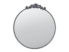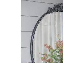 This beautiful mirror features baroque-inspired elements at the top. The mirror is custom inlaid glass surrounded by a black solid iron frame.