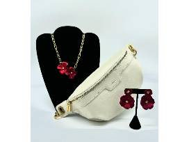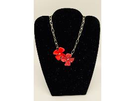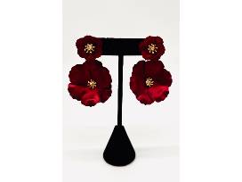 Exquisite dark red floral earrings and necklace with lustrous gold centers.