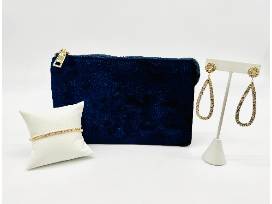 A captivating set featuring a midnight blue velvet clutch, complemented by a pair of teardrop-shaped golden earrings with intricate details.