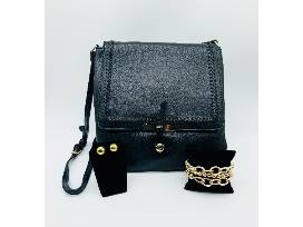 Classic elegance meets modern flair with this set, featuring a sleek black handbag, paired with lustrous golden stud earrings and a matching bracelet.