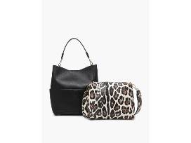 This popular style includes an inner bag in snow leopard print with a removable handle and a removable guitar strap that can be attached to either the main or inner bag. Features side and front pockets and gold-tone hardware. Made of vegan leather.