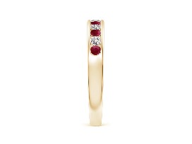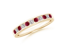 Alternately arranged on this classic semi eternity band are scarlet rubies and white diamonds in a channel setting. This band exhibits a subtle yet glamorous appeal with the stunning combination of rubies and diamonds set in 14K Yellow Gold.