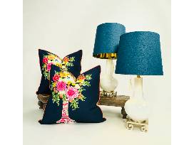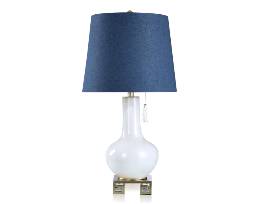 Features a white glass base and blue lampshade. Features gold accents and tassel pull-chain light switch. 150W.