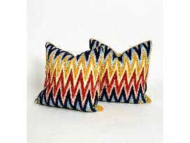 This set of pillows dazzles with a dynamic zigzag pattern, rendered in a luxurious blend of deep blues, bold golds, and warm rust tones. The design brings a lively energy to any interior, making these pillows a perfect pair for infusing a room with color and movement. Whether used to adorn a sofa or as statement pieces on a bed, they offer both visual intrigue and plush comfort.