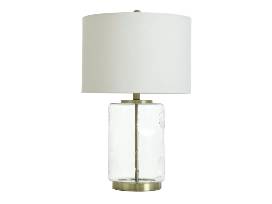 Textured glass table lamp featuring brushed brass accents and a white lampshade.