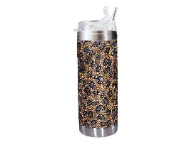 20oz vacuumed sealed, double walled stainless steel tumbler for hot or cold beverages. Each resin crystal lattice encased tumbler includes a food grad slider lid and straw packaged in an attractive black velvet gift bag.