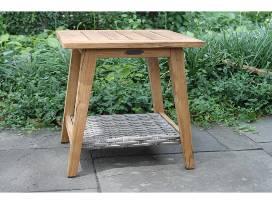 The Outdoor Interiors 20" Teak and Wicker Accent Table features a beautiful, slated teak top and light-grey wicker accent shelf.