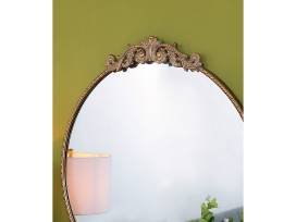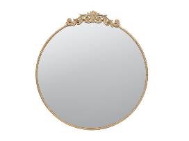 This beautiful mirror features a custom inlaid glass design and solid iron frame in gold, inspired by baroque art elements.