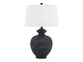 Add a bit of contemporary style to your space with the Memphis table lamp. It features a sleek black curved base, a white drum shade, and a three-way switch. This lamp is great for a small table or nightstand.