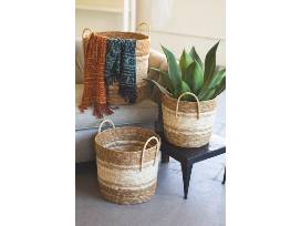 White and natural two-toned set of 3 round baskets are so versatile! They are a great way to store items, use with a potted plant, or use anywhere you need to fill a space.