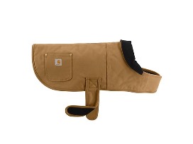 Carhartt's redesigned dog chore coat is made with firm-hand duck canvas and a water-repellent coating, which protects your pup in wet, windy weather. The quilted liner of the dog winter coat adds warmth, while improved tabs at the neck and chest make it simple to take on and off.