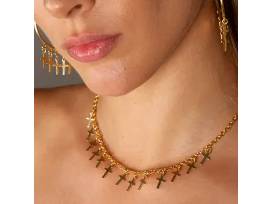 Thirteen gold mini crosses on a gold chain. Plated in 18k gold. Made in Brazil.