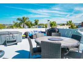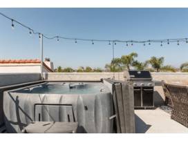 HUGE 500 SQUARE FOOT ROOF TOP DECK WITH HOT TUB & BEAUTIFUL OCEAN, BAY AND CITY VIEWS!! The city lights are absolutely gorgeous at night! 3 chaise loungers for your own private Vitamin D intake. Roof top BBQ and high bar top patio set with fire pit to take in the Ocean views. On clear days, you can see clear to Catalina. Inside, the luxurious open-plan layout offers oceans of stately space with 5 bedrooms and 3 bathrooms. Light grey colors throughout; light grey floors, and a stunning corner-aspect chef's kitchen with new granite and blue back splash to add to the beach vibe.