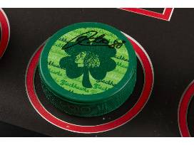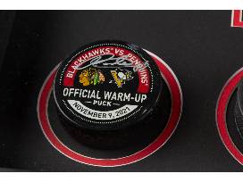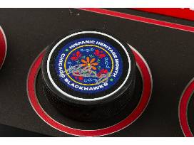 Pucks from 2022-23 season: Official warm up puck, Hispanic Heritage Night Puck, St Patrick's Day Puck, Home Opener theme Puck