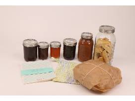 Enjoy this basket of homemade goodies from Eleven Gables on Occasional Pond. The basket includes a hand-knitted cotton potholder, two European dish cloths, 1 qt. of "pearpple" sauce (apples and pears), 1 pt. of cinnamon crabapple butter, 1 pt. of crabapple jelly, 0.5 pt. of peach jelly, 0.5 pt. of pear butter, 1.5 lbs. of Irish soda bread and 1 dozen sweet scones. Soda bread and scones will be baked fresh the week of Bourbon and the Bayou.