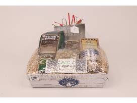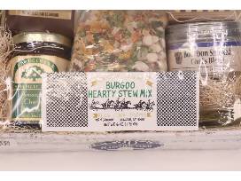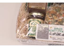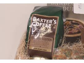 This basket is full of Southern comfort and charm! It contains a bag of Baxter's Kentucky Bourbon flavored coffee (12 oz.), a pack of Flag Fork Burgoo Hearty Stew Mix (6 oz.), a tin of Bourbon Barrel Smoked Chef's Blend Seasoning (3.5 oz), a jar of Apple Creek Amaretto Cherry Preserves (8 oz.), a box of Candleberry Kentucky Bourbon Wax Melts, two "Got Bourbon" rocks glasses, and the "Burgoo, Barbecue & Bourbon" cookbook by Albert Schmid.