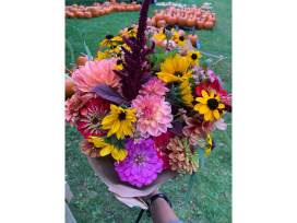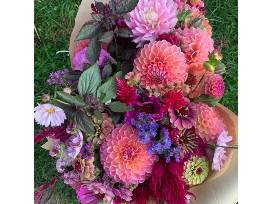 Bring home a large bouquet of beautiful dahlias! These flowers are locally grown. This certificate entitles you to one 10-stemmed bouquet packaged with a unique blown glass vase (purple) made by Trifecta Glassworks (approximately 6 in. tall). Flowers are available for pick-up at Carbajal's Garden Center in Lawrenceburg, KY or can be delivered to Lexington on a Saturday. This certificate is redeemable September 1st through the first frost of 2024.