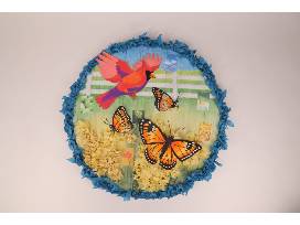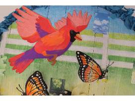 This bourbon barrel head (21 in. diameter), designed with mixed media by Rebekah Longworth, features some of Kentucky's finest flowers, butterflies, and the state bird, the Cardinal.