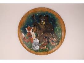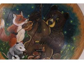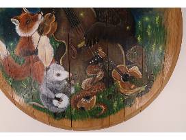 This bourbon barrel head (21 in. diameter) painted by Desiree Dora depicts a whimsical scene of forest creatures getting together to play bluegrass music under the starry night sky.