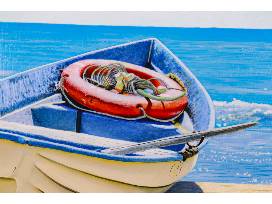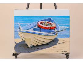 This 16 in. x 20 in. painted canvas from DecoArt depicts a bright scene of a rowboat on a beach and is the perfect addition to brighten up any home.
