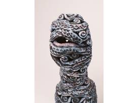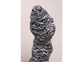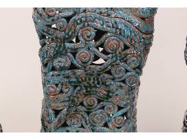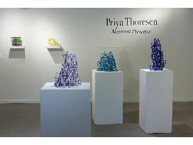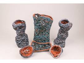 Priya Thoresen is a ceramic artist who creates vibrant and modern vessels that draw inspiration from architecture and organic matter. Thoresen's pieces are characterized by deep colors and intricate patterns, which are influenced by the concept of minimalism, the structures of weaving, and the beauty of ocean life. Whether displayed as individual works of art or as part of a larger collection, Thoresen's vessels are sure to captivate and inspire. All three pieces are approximately 18 inches tall.
